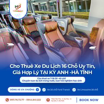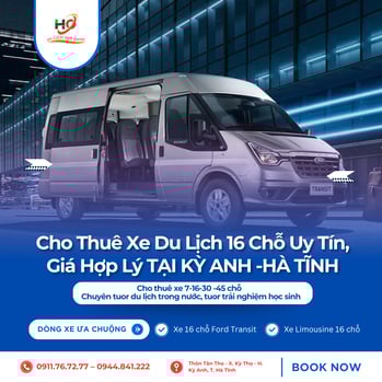 CÔNG TY TNHH DU LỊCH HUỆ OANH tự hào là đơn vị cho thuê xe uy tín và chuyên nghiệp tại Kỳ Anh, Hà Tĩnh. Với hơn 10 năm kinh nghiệm trong ngành, chúng tôi đã phục vụ gần 15.000 khách hàng, bao gồm các công ty, tập đoàn, tổ chức lớn nhỏ, cùng hơn 50.000 chuyến xe an toàn trên khắp các nẻo đường. Nhờ vào chất lượng dịch vụ vượt trội, chúng tôi vinh dự là một trong những đơn vị cung cấp dịch vụ cho thuê xe 16 chỗ uy tín, đáng tin cậy.